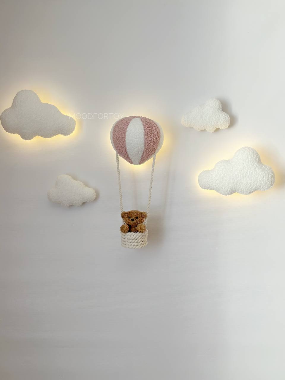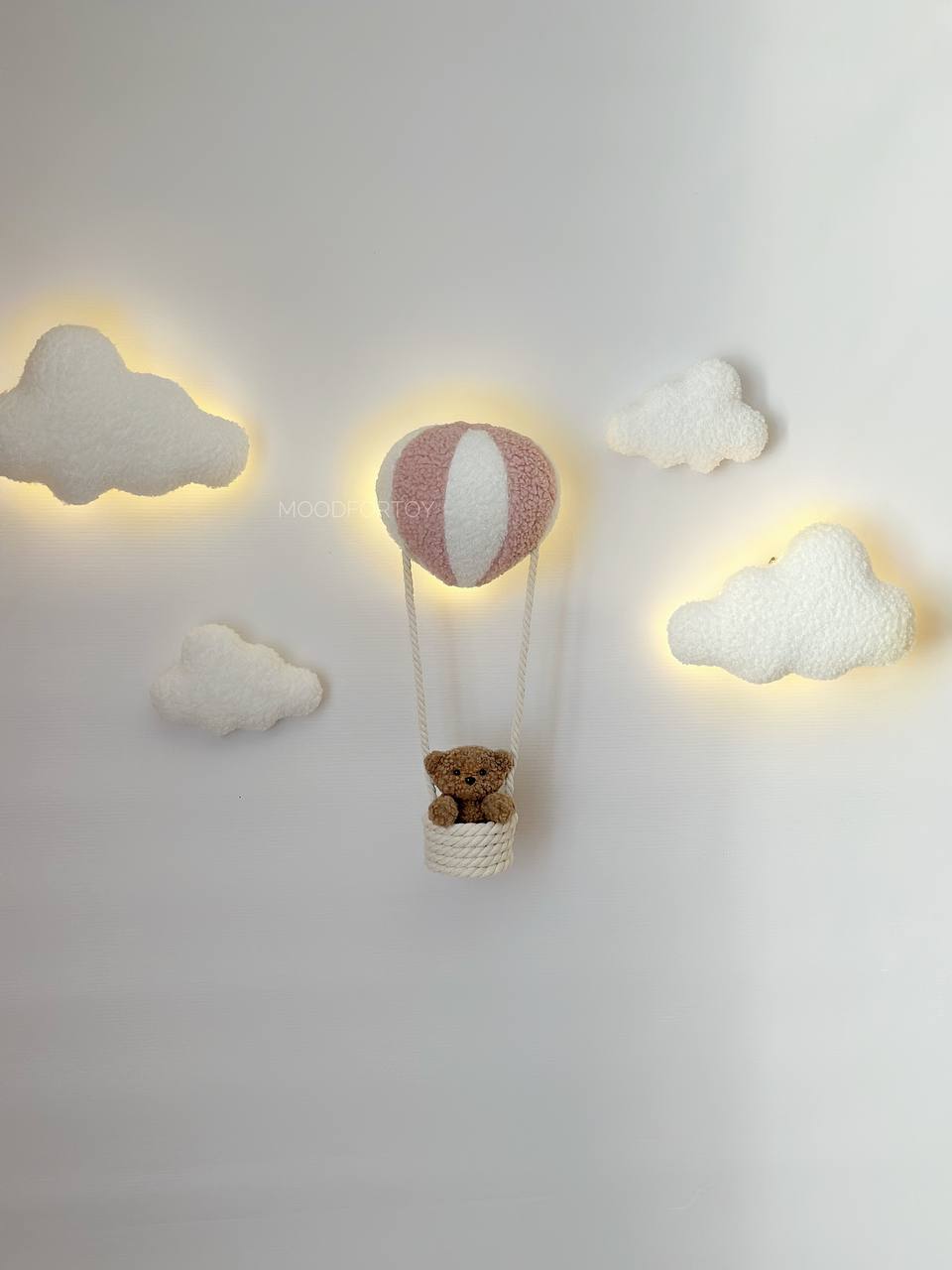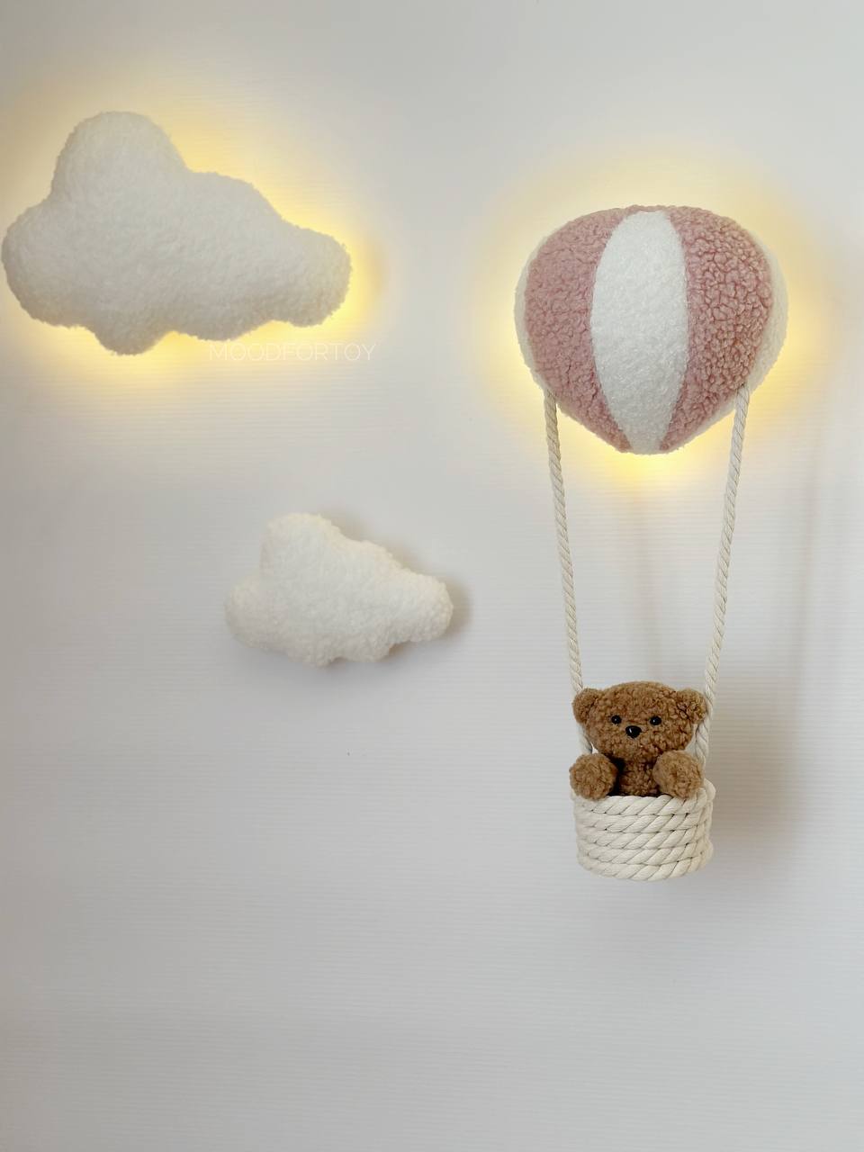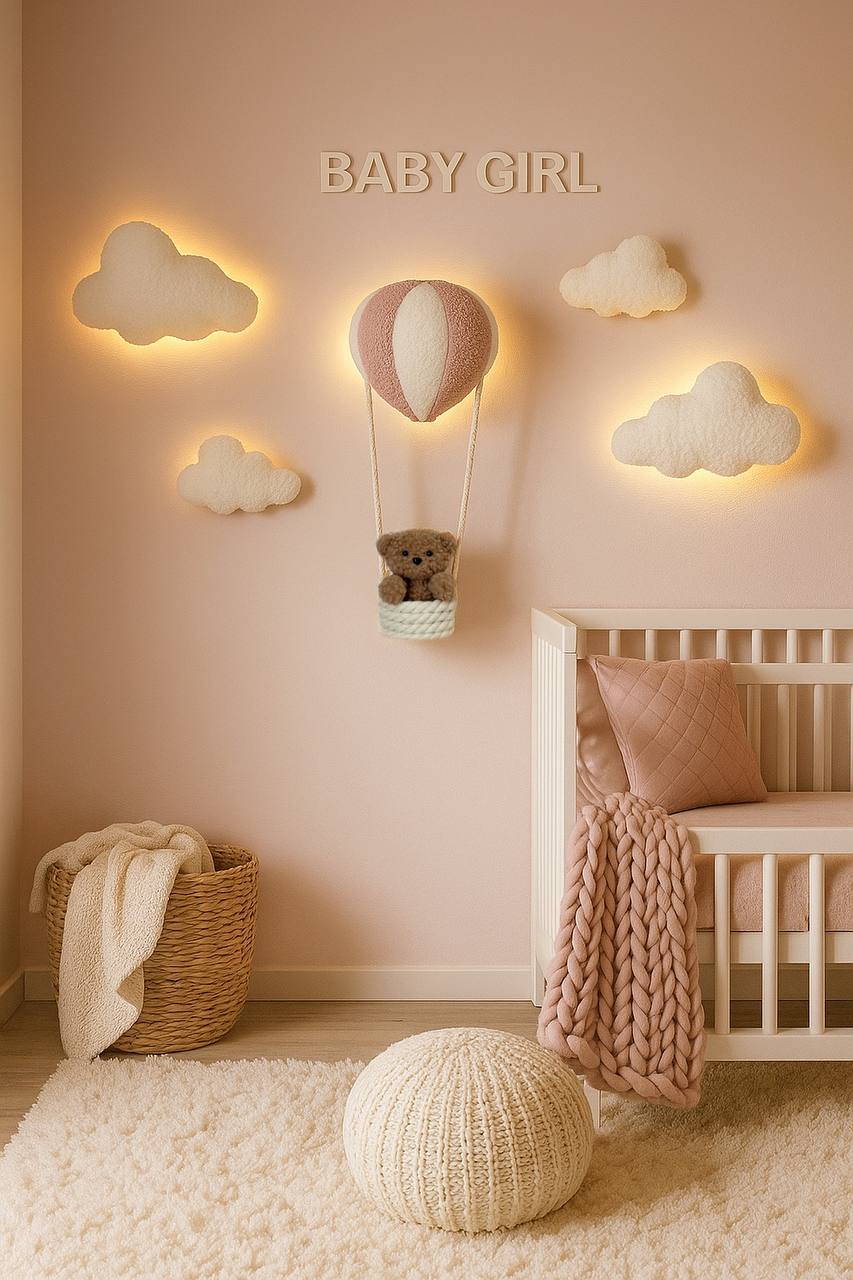 Stylish wall decor with LED lighting creates a cozy and magical atmosphere in your child’s room. The composition includes soft clouds and a hot air balloon with a basket carrying a cute teddy bear. This accessory is perfect for both boys and girls.
