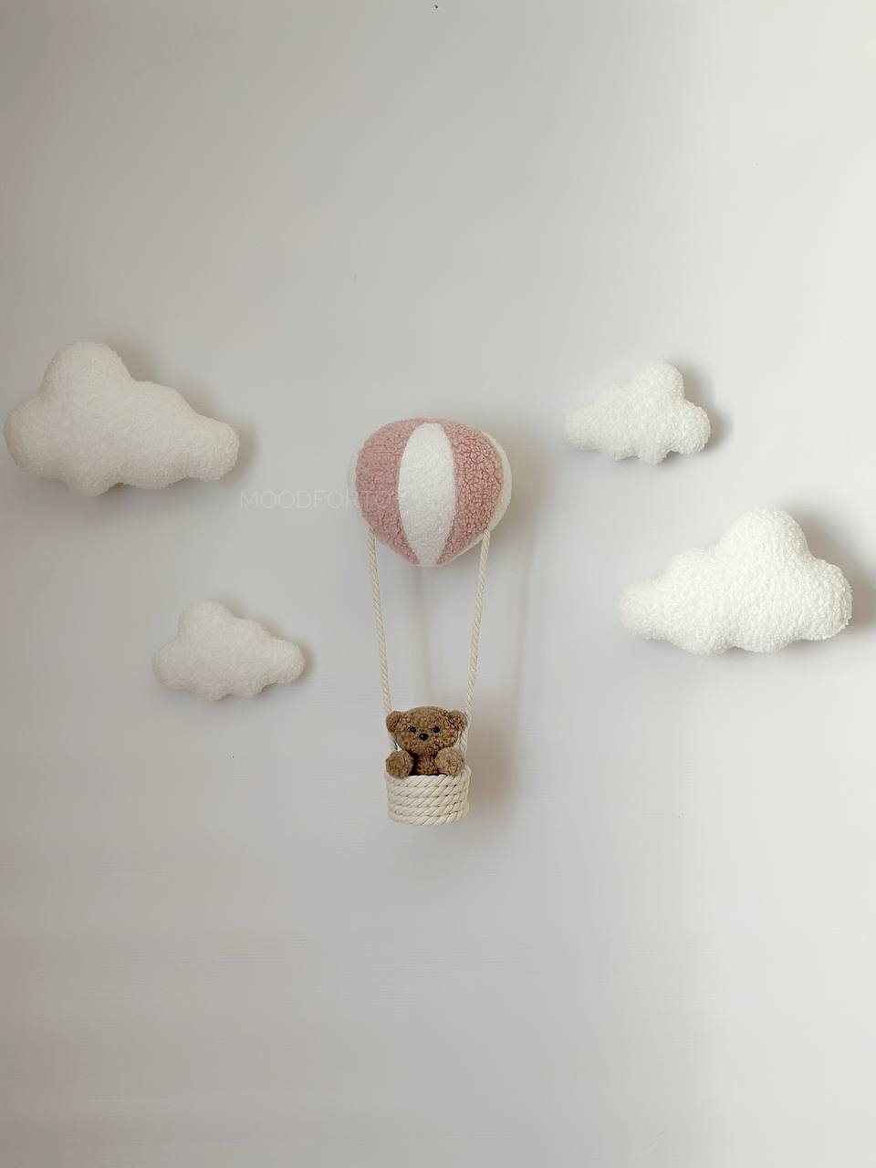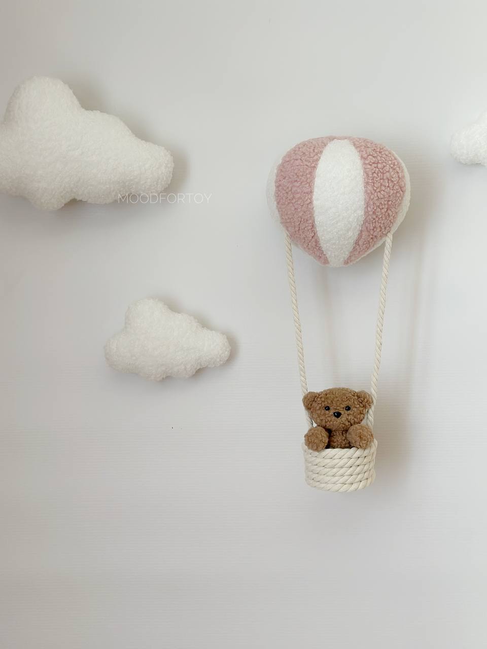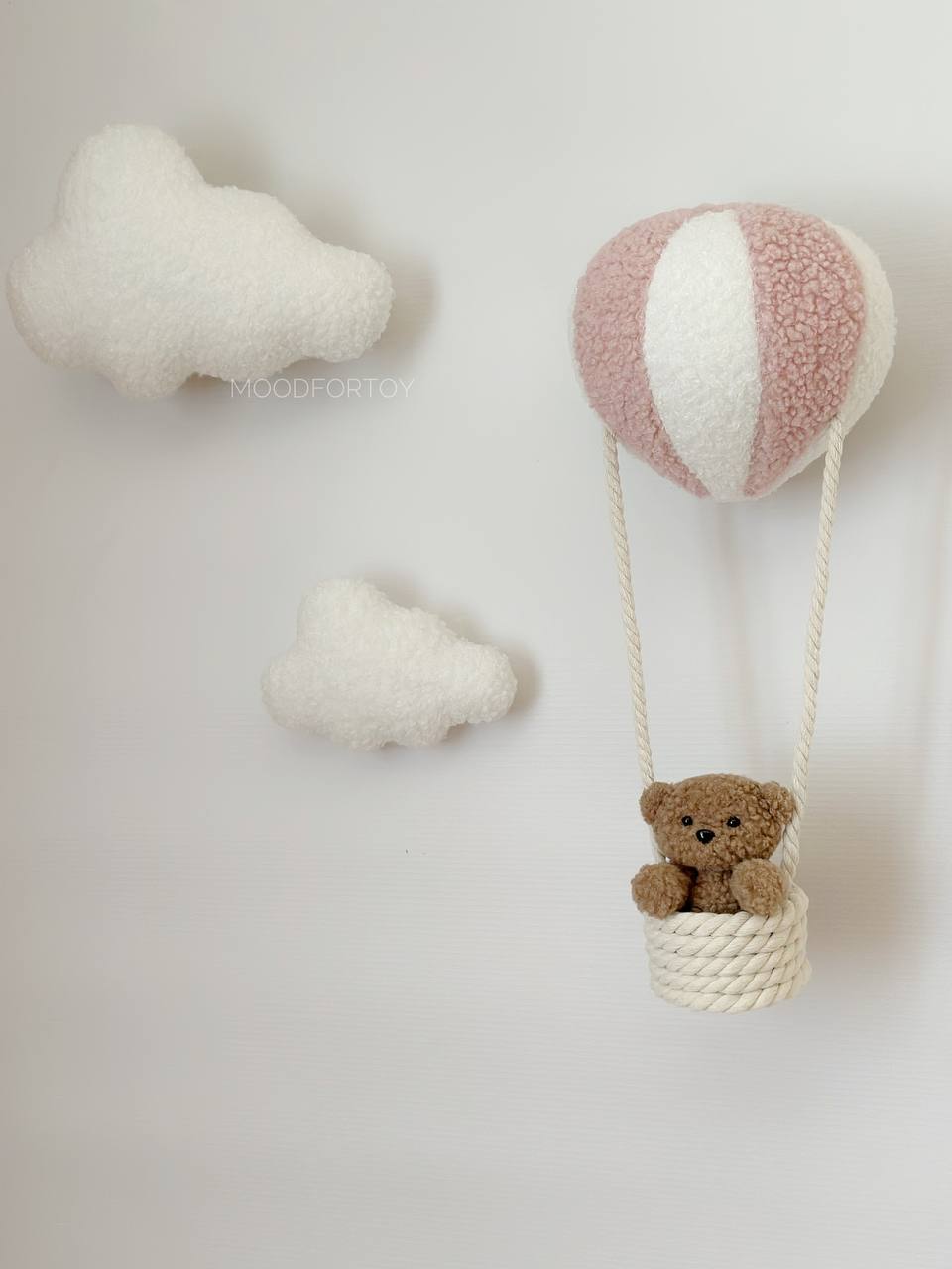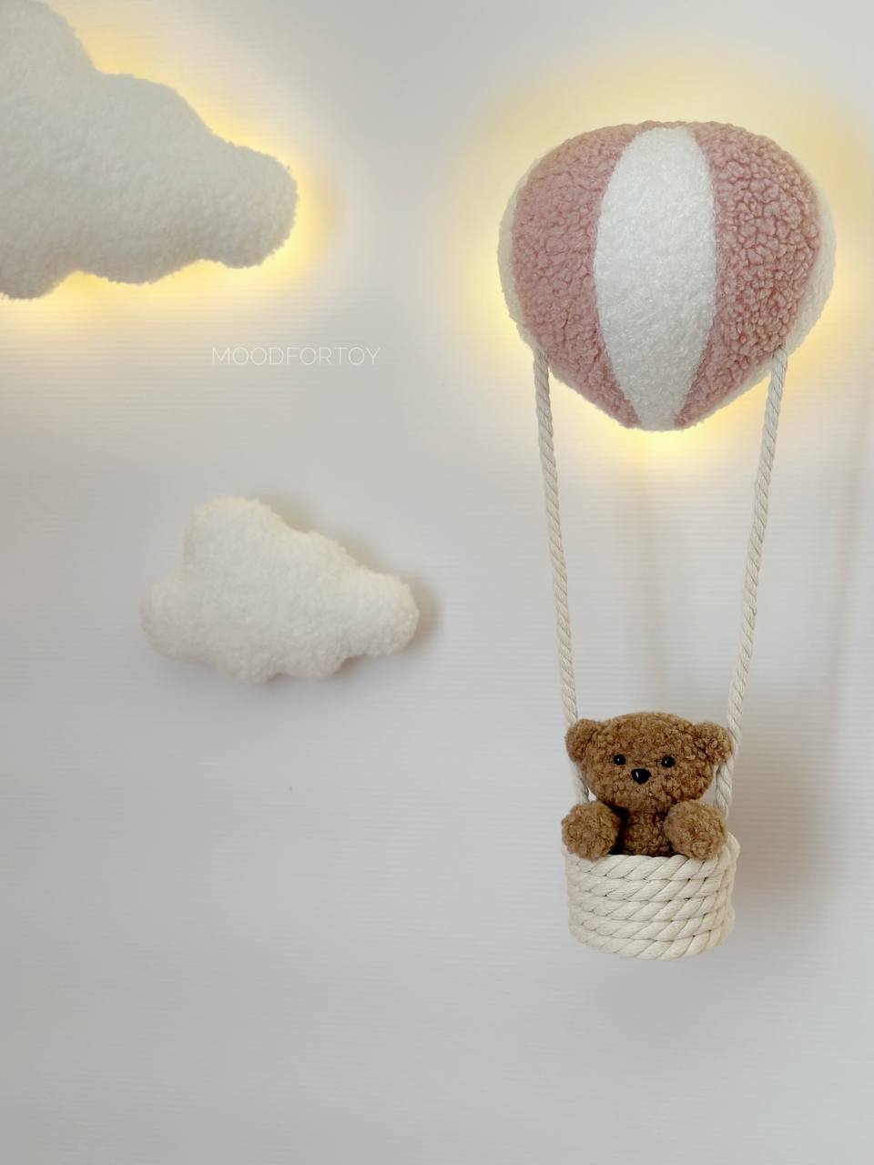 Stylish wall decor with LED lighting creates a cozy and magical atmosphere in your child’s room. The composition includes soft clouds and a hot air balloon with a basket carrying a cute teddy bear. This accessory is perfect for both boys and girls.